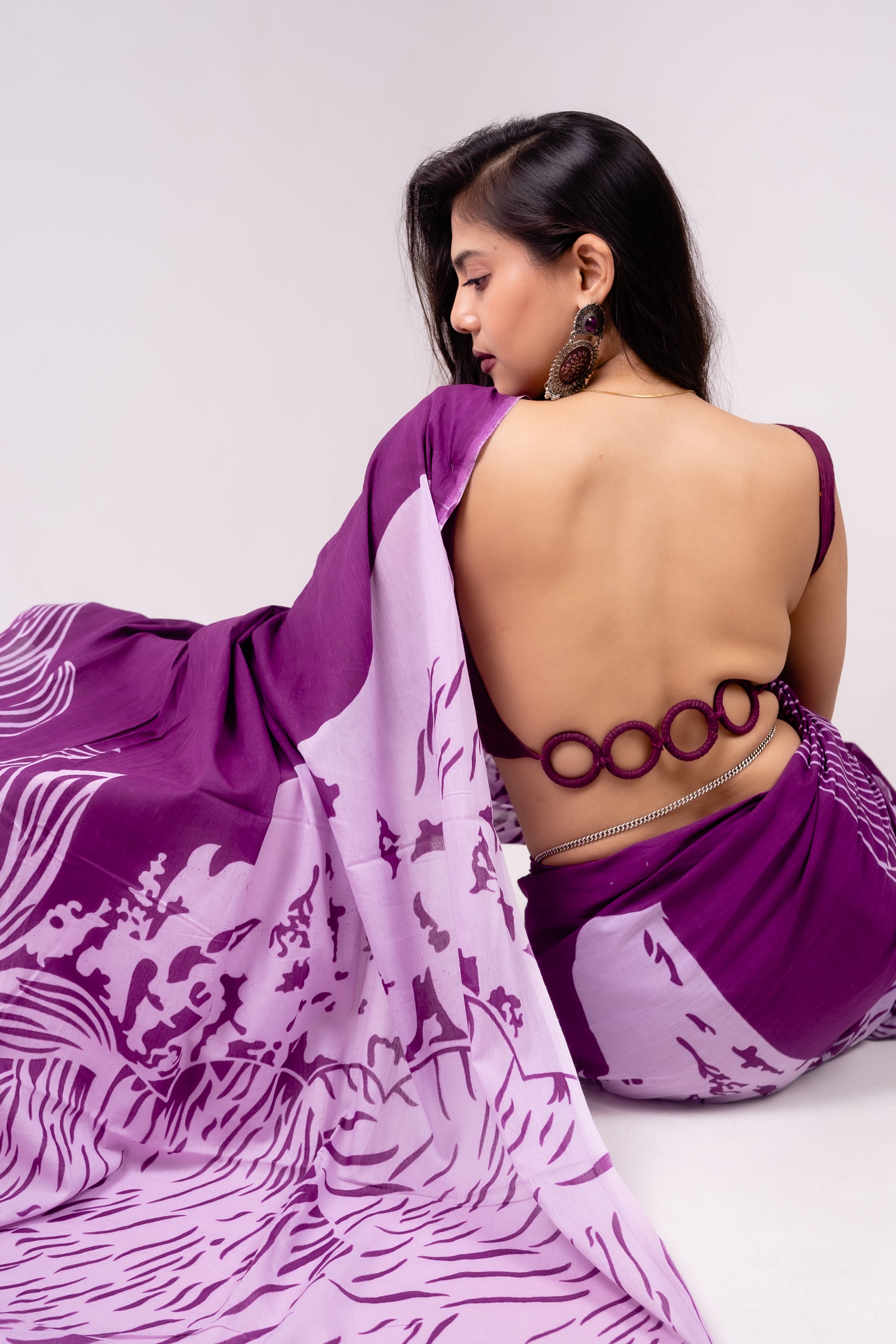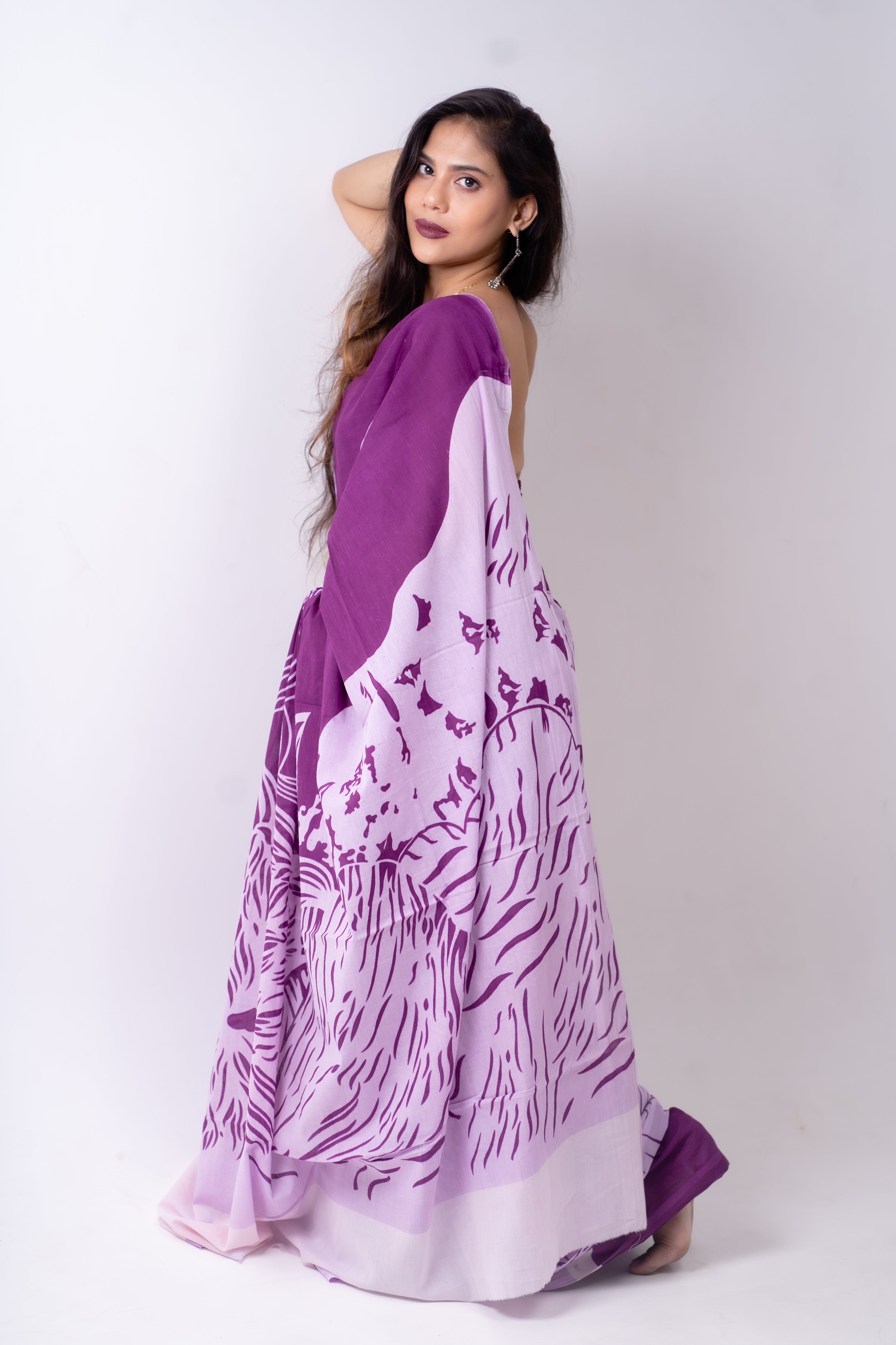 She doesn’t whisper. She arrives. With a palette of power and poise, The Lilac Roar is for women who lead from instinct, grace, and unapologetic fire. This purple and lavender saree features bold animal-inspired motifs that speak softly—but carry a wild, unshakable confidence. Crafted in soft, flowy fabric that drapes like a second skin, it’s a fierce-yet-feminine choice for creative workdays, gallery evenings, poetry readings, and days when you refuse to shrink yourself to fit into anything.