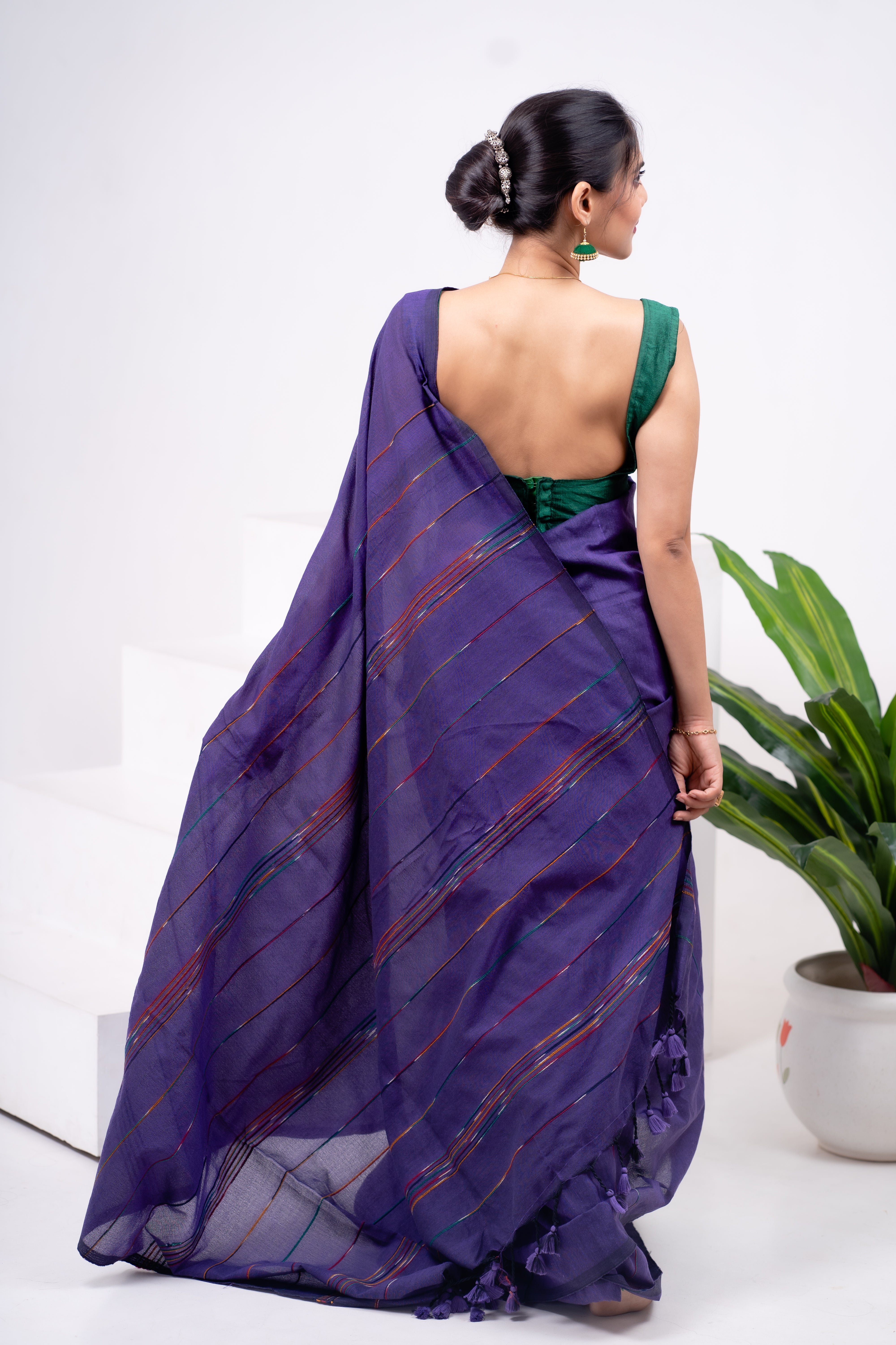 Team it with a sleeveless brown blouse or a high-neck khadi top. Add bold silver hoops or earthy wooden bangles. Keep your hair messy or in a low bun — this saree adapts to your mood.