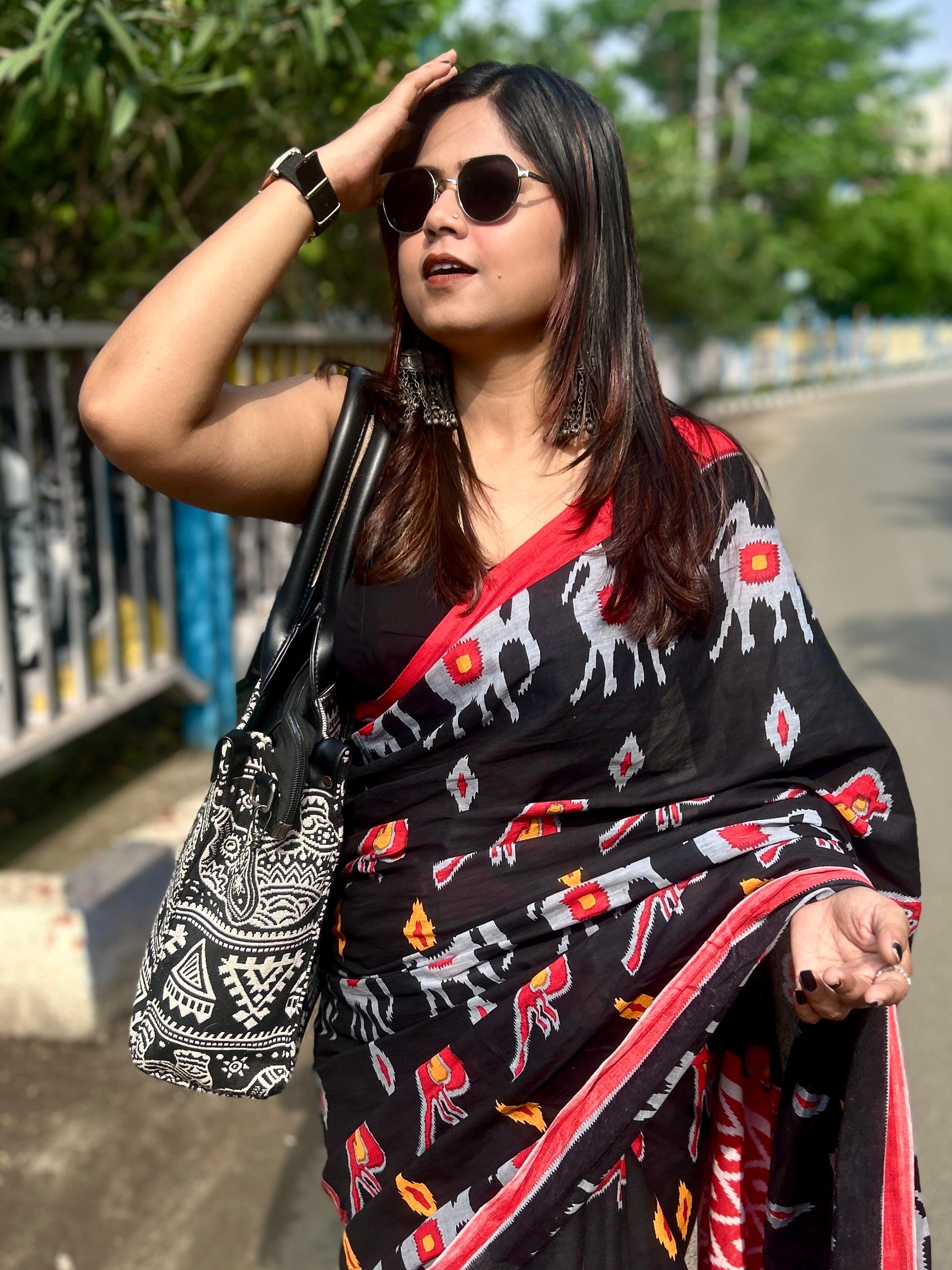 Color: Black base with multicolor tribal animal motifs and red-white Ikat pallu
